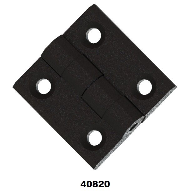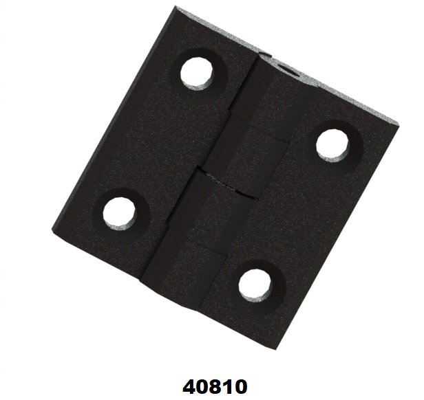 Dobradiça injetada em Poliamida com Fibra de Vidro com pino em aço inox 304. Elementos de fixação zincado branco ou preto. Acabamento preto.