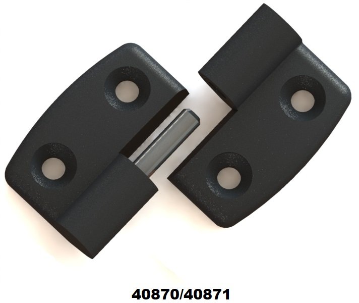 Dobradiça injetada em Poliamida com Fibra de Vidro com pino em aço 1020 Acabamento preto. Montagem em porta embutida ou sobreposta para gabinetes individuais; em porta embutida para gabinetes acoplados; ou em perfil de alumínio. Possibilidade de extração da porta por sistema de encaixe. Fixação na estrutura, na porta e no perfil de alumínio através de parafusos e porcas
