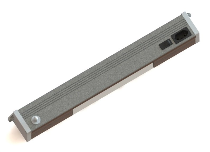 Corpo em perfil de alumínio anodizado fosco, tampas laterais em termoplástico UL94-V0